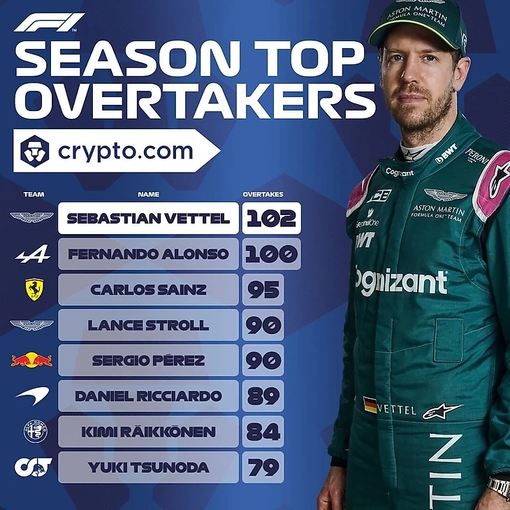Феттель и Алонсо первыми достигли отметки в 100 обгонов за сезон: Себ лидирует (102), Фернандо располагается на второй строчке (100). Их ближайшими преследователями являются Карлос Сайнс из «Феррари» (95), Стролл и пилот «Ред Булл» Серхио Перес (по 90).