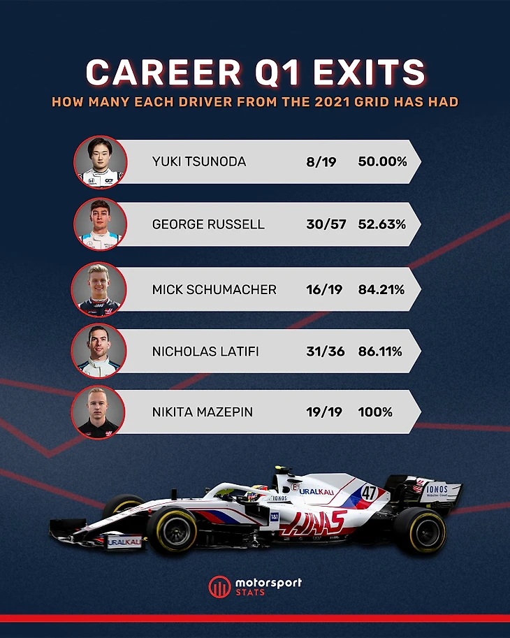 Напарник Мазепина Мик Шумахер в процентном соотношении опережает не только россиянина, но и Николаса Латифи. Шумахер заканчивал выступления после первого сегмента в 16 случаях из 19 – 84,21%, в то время как у Латифи этот показатель составляет 31 из 36 – 86,11%.