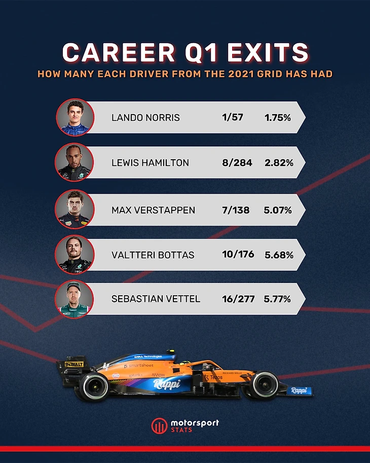 В то же время лидером по проценту успешного преодоления первого сегмента квалификации является Ландо Норрис – из 57 случаев британец лишь один раз за карьеру не сумел пройти во второй сегмент.