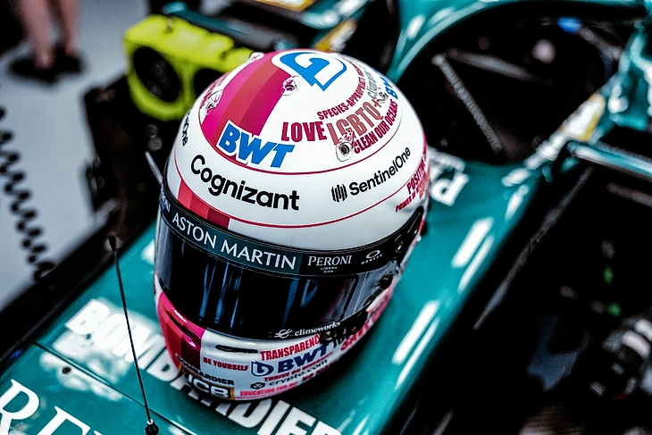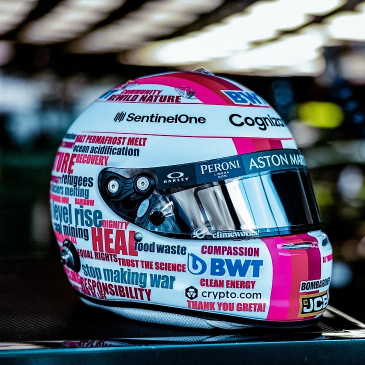 Четырехкратный чемпион «Формулы-1» обратил внимание на проблемы, стоящие перед современным обществом: загрязнение окружающей среды, изменение климата и права человека. На шлеме присутствуют надписи «природа», «повышение уровня океана», «сохранение биоразнообразия», «таяние ледников», а также «дискриминация», «любовь», «ЛГБТК+», «беженцы» и многие другие.