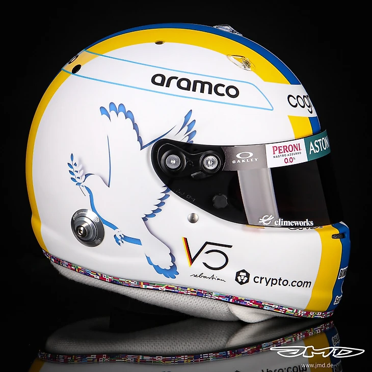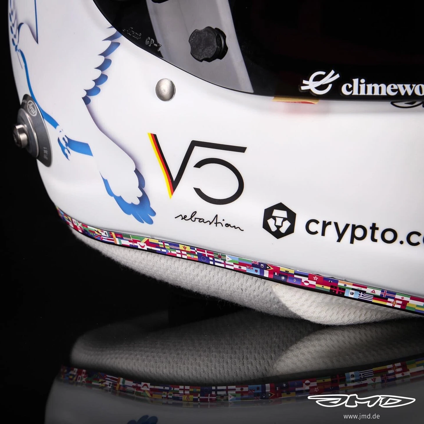 Феттель заменил традиционные для себя черную, красную и желтые полосы на синюю и желтую. В нижней части шлема расположены флаги множества государств, в верхней – слова песни Джона Леннона Imagine.