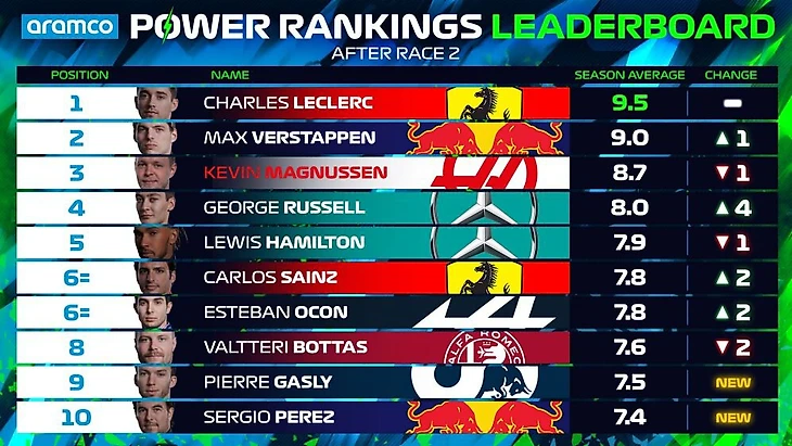 За этап в Джидде Леклер, закончивший гонку на втором месте, получил 9 баллов. Также в топ-3 попали выигравший заезд Макс Ферстаппен («Ред Булл») (8,8), и Джордж Расселл («Мерседес») (8,4).
