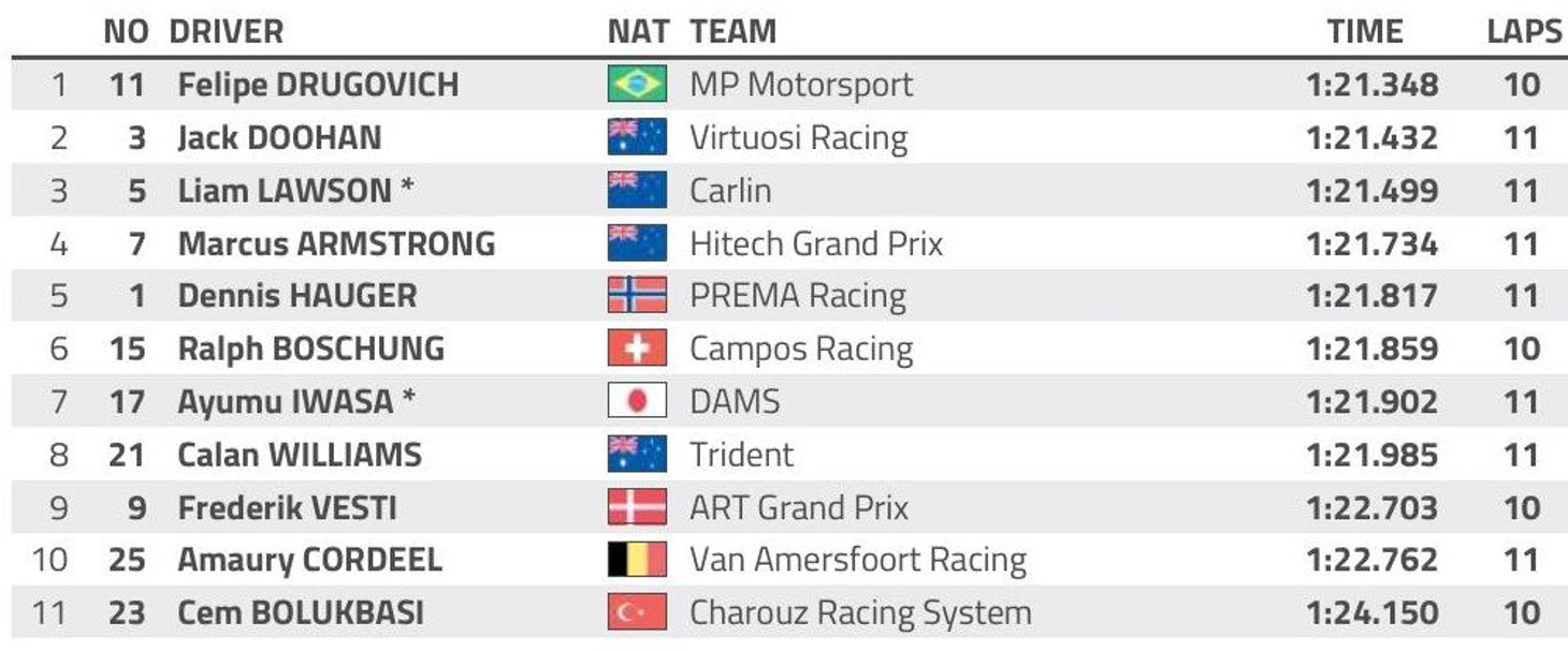 Обновление: заключительные круги Лоусона и Ивасы удалили, так как они были завершены под желтыми флагами, поул достался Друговичу. Кроме этого, Лиам потеряет пять позиций на старте спринта, Аюму – десять (пилот «ДАМС» проехал под двойными желтыми флагами).