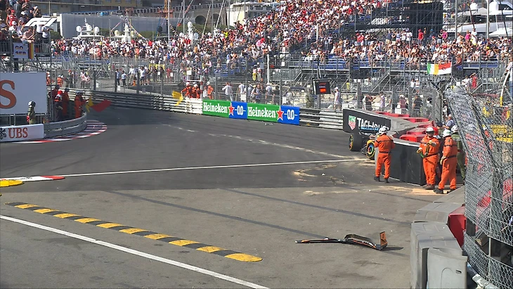 Риккардо потерял болид в секции «Бассейн» и врезался в барьеры. Сессия остановлена красными флагами. За несколько минут до этого пилот «Астон Мартин» Себастьян Феттель едва не попал в похожую аварию, однако избежал контакта со стеной.