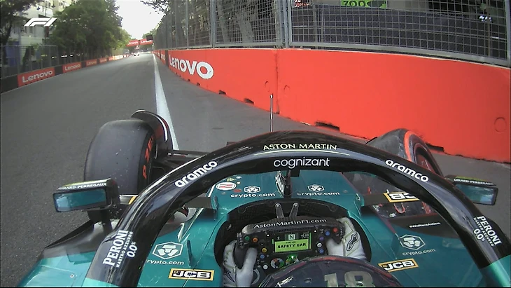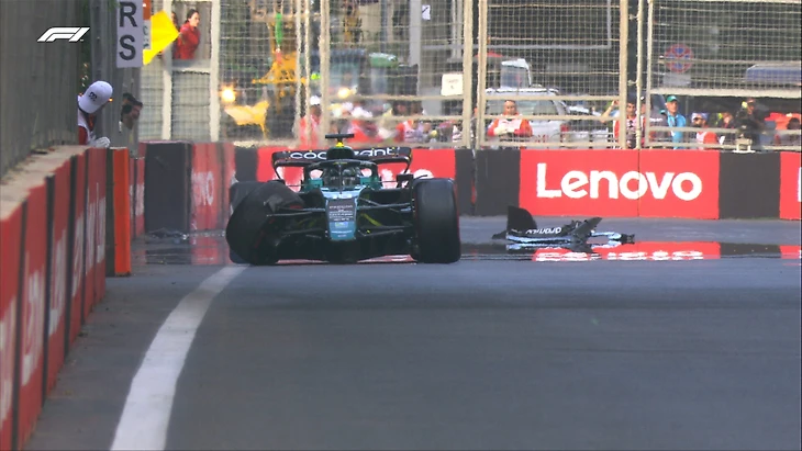 Стролл дважды дошел до контакта с ограждениями: сначала столкнулся с барьерами и, по всей видимости, повредил переднее антикрыло, а затем решил не заезжать в боксы, начал новый круг и врезался в стену во втором повороте.