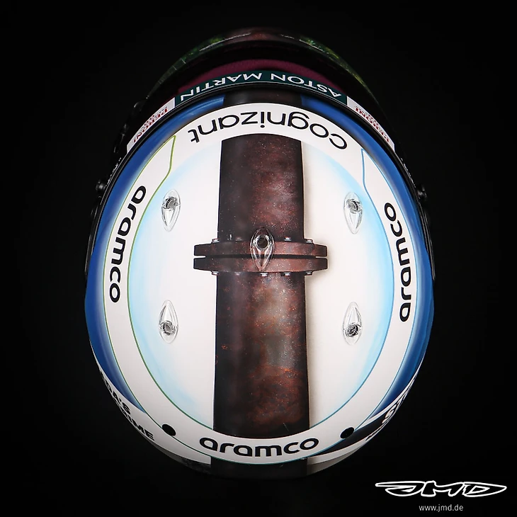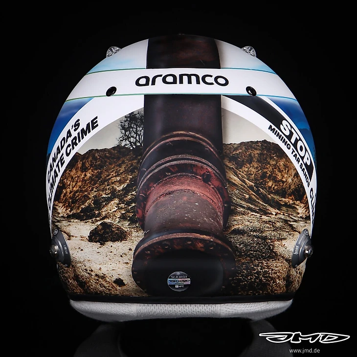 Четырехкратный чемпион «Формулы-1», пилот «Астон Мартин» выступил против разработки битуминозных (нефтяных) песков в канадской провинции Альберта. На ливрею нанесены надписи «Прекратите разработку нефтяных песков» и «климатическое преступление Канады».