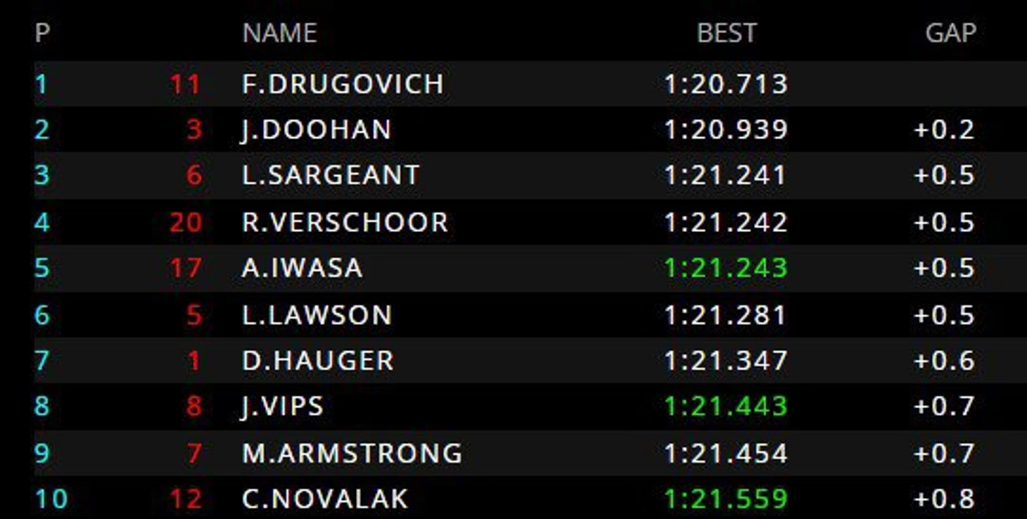 Лидер чемпионата опередил Джека Дуэна («Виртуози») и Логана Сэрджанта («Карлин»). Представитель «ДАМС» Аюму Иваса стал пятым, Лиам Лоусон из «Карлина» – шестым, Юри Випс («Хайтек») – восьмым.