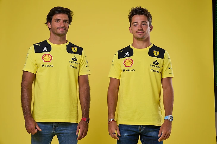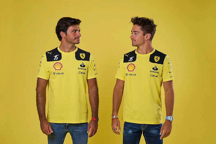 Шарль Леклер и Карлос Сайнс представили желтые футболки. Giallo Modena – оттенок, который использовался при покраске автомобилей «Феррари», в том числе культового F40.