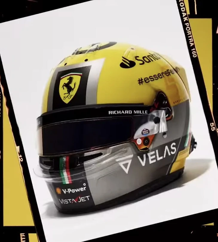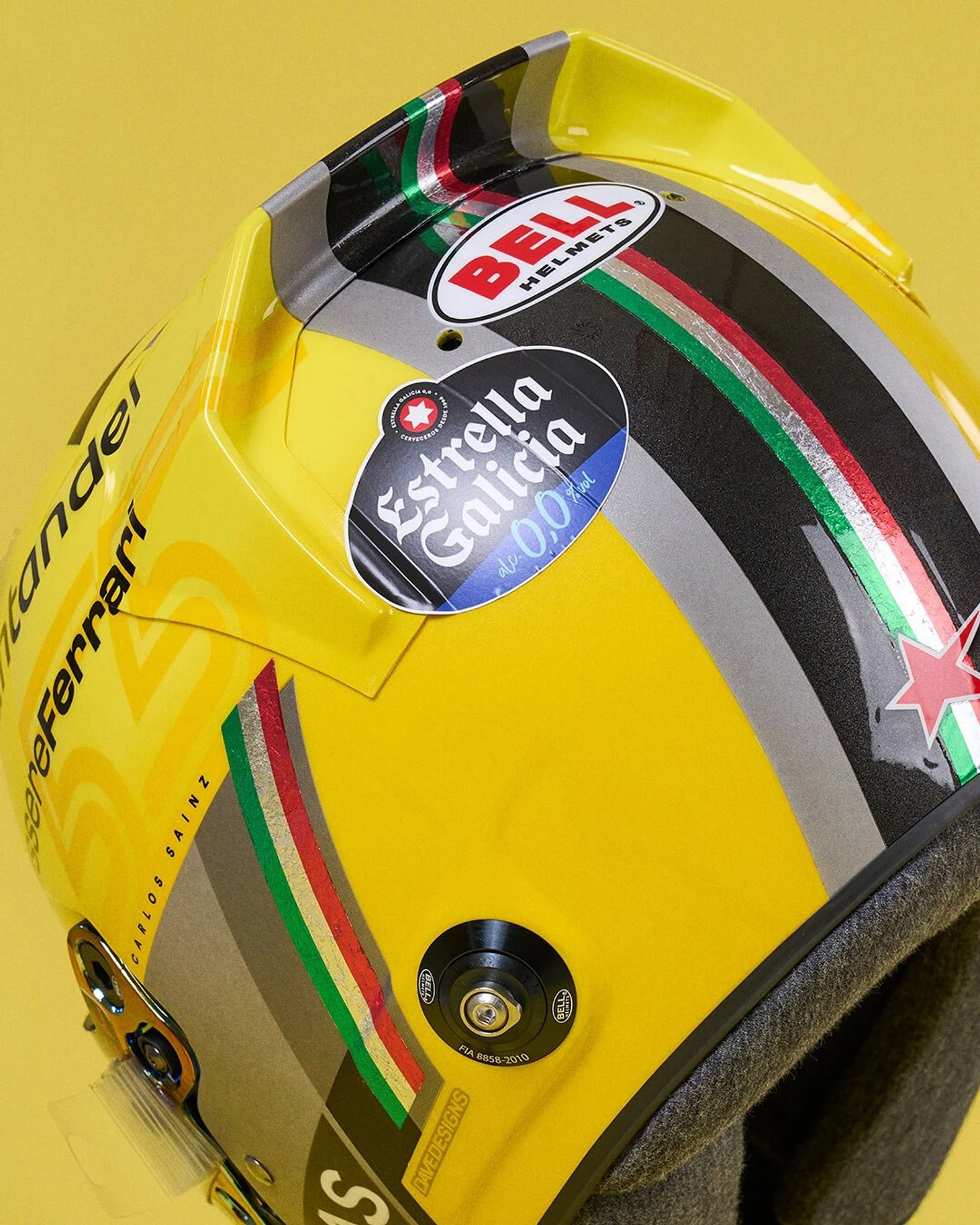 Испанец подготовил желтый шлем – под комбинезоны «Феррари» и ливрею, выполненную с добавлением данного цвета. На Гран-при Италии команда отмечает 75-летие своего первого болида 125 S, произведенного в Модене, поэтому использует оттенок Giallo Modena.