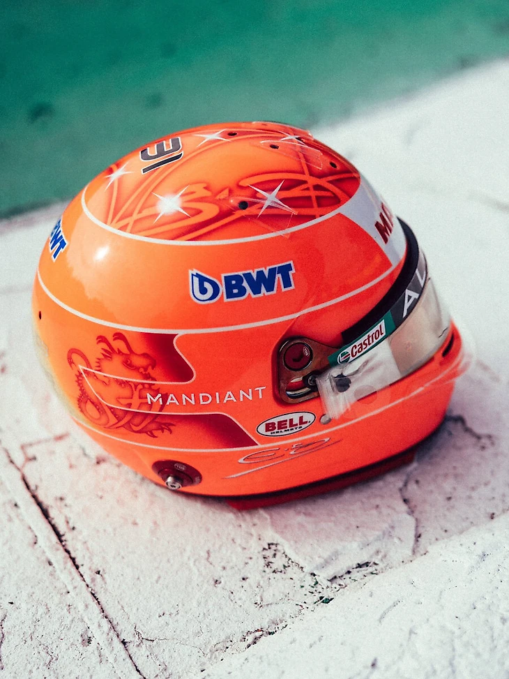 Дизайн стал данью уважения семикратному чемпиону «Формулы-1» Михаэлю Шумахеру – «герою для Эстебана», как сообщила «Альпин» в соцсетях. На шлеме Окона присутствуют элементы, которые использовал Шумахер – дракон и звезды. На задней части размещены сезоны пяти побед Михаэля в Монце.