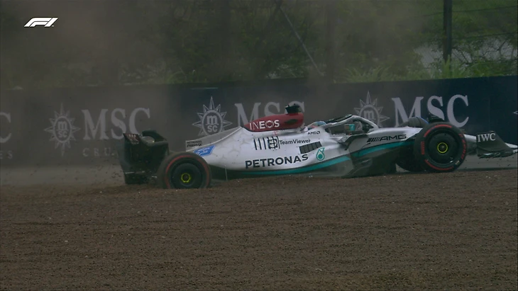 Квалификация остановлена красными флагами после вылета Расселла в гравий. Магнуссен на промежуточном поуле, над трассой усилился дождь