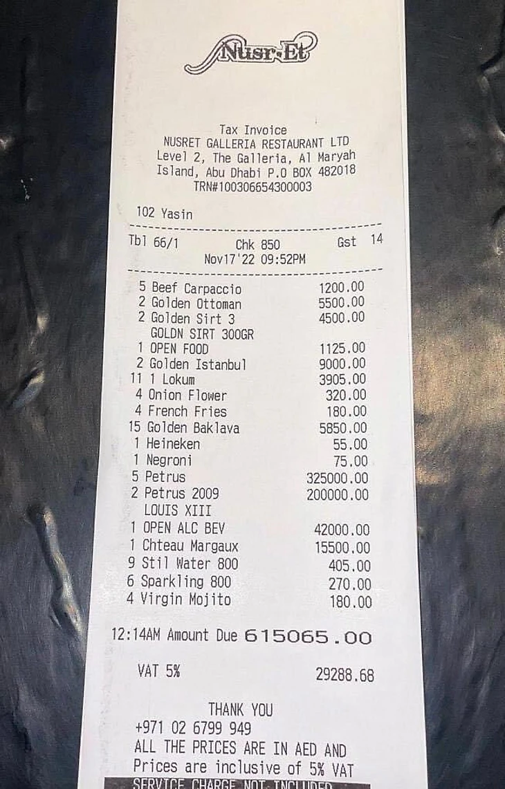 Если же информация о чеке правдива, то получается, что за весь ужин гонщики заплатили 615 000 дирхамов, или около 166 000 долларов.