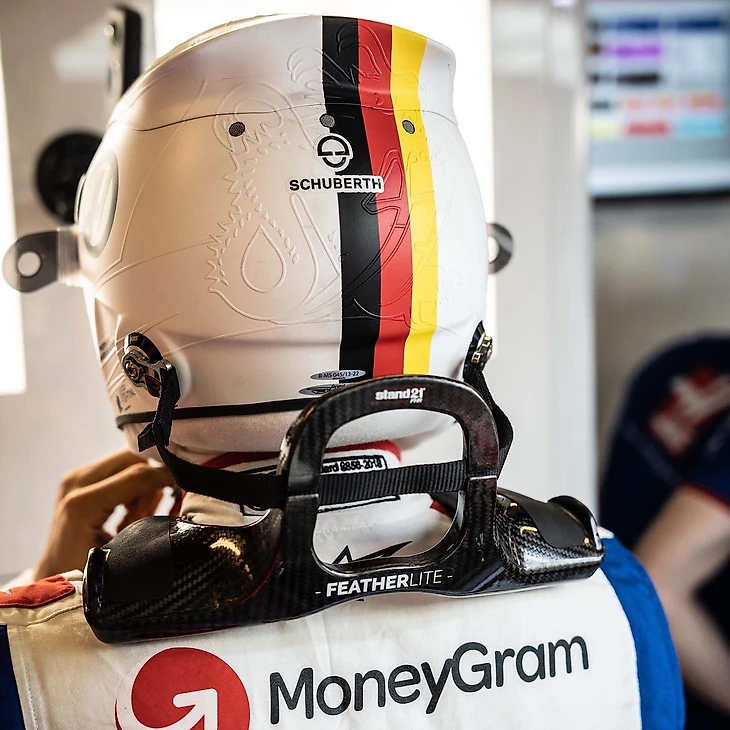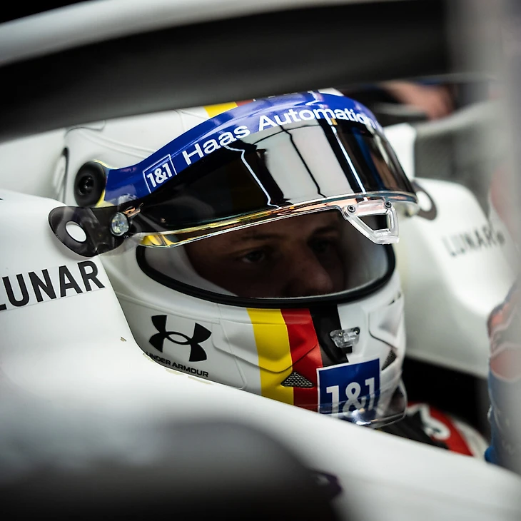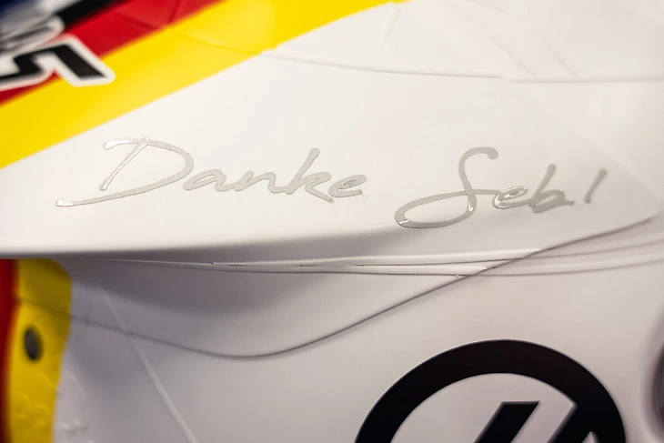 На шлеме размещены полосы в цветах немецкого флага, которые использовал друг и наставник Мика – пилот «Астон Мартин» Себастьян Феттель. Также присутствует надпись «спасибо, Себ».