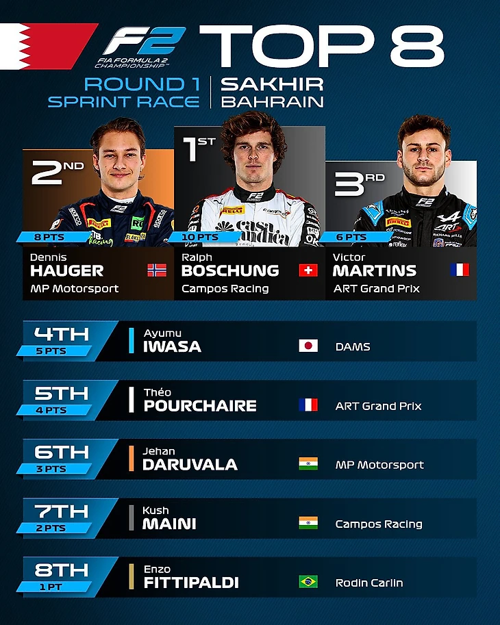 Формула-2. Бахрейн. Бошунг одержал первую победу за 7 сезонов, Хаугер и Мартен – в топ-3 спринта
