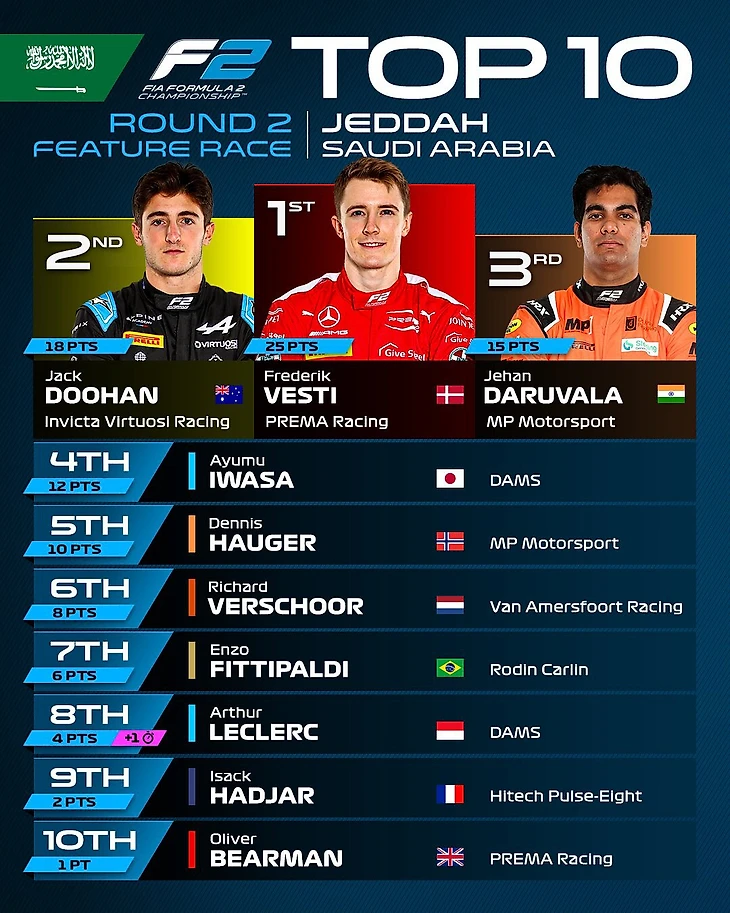 Формула-2. Саудовская Аравия. Вести выиграл 2-ю гонку, Дуэн – 2-й, Дарувала – 3-й, Мартен сошел с поула