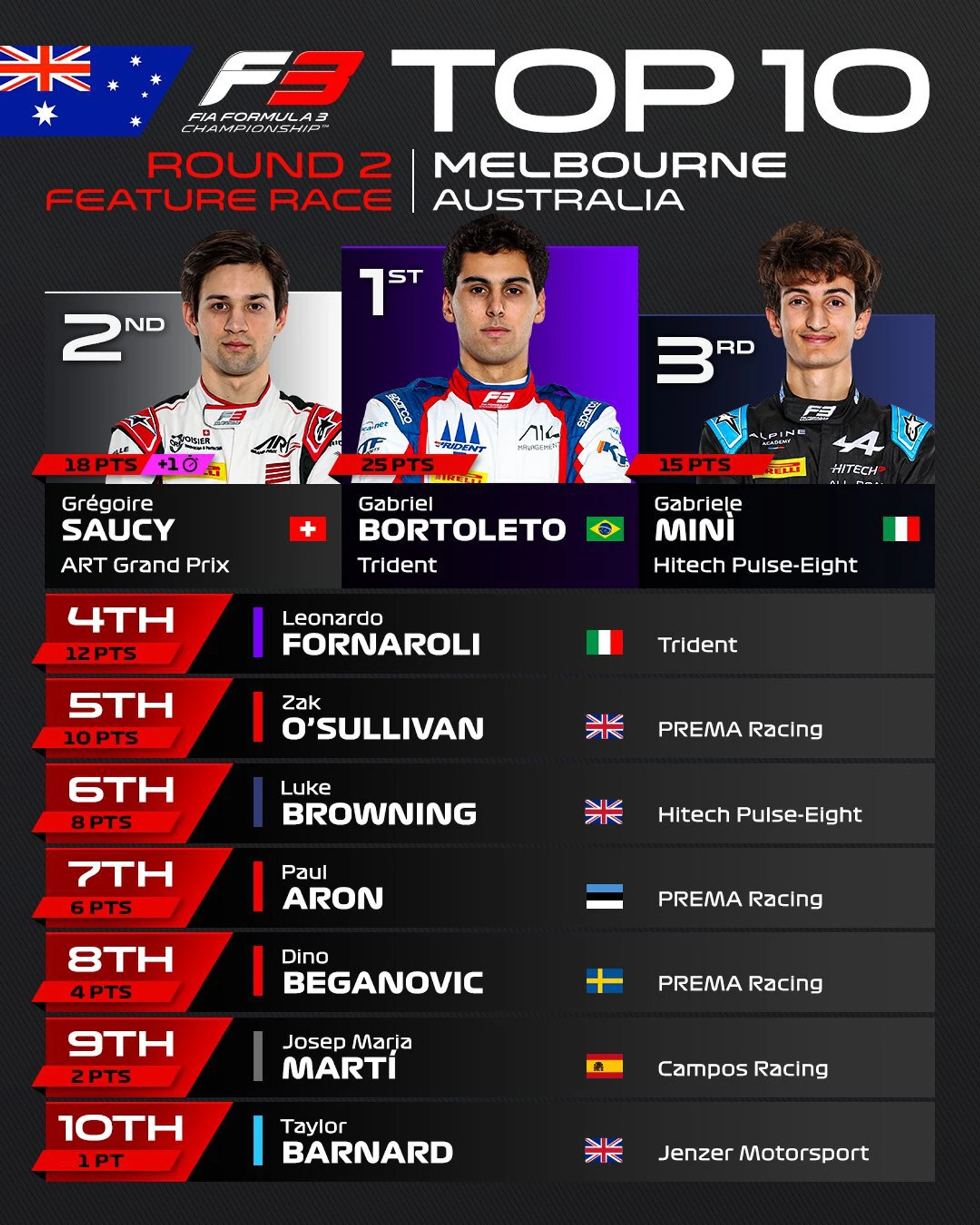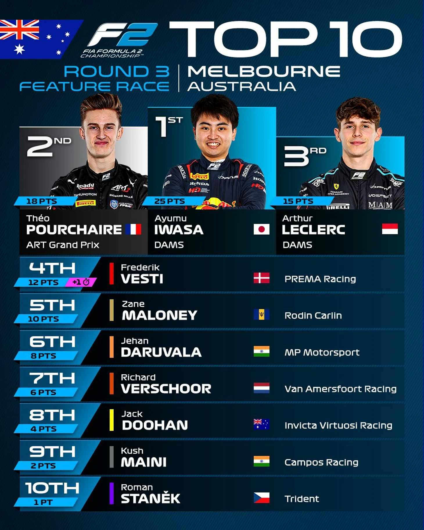 Иваса выиграл 2-ю гонку «Ф-2» в Австралии, Артур Леклер на подиуме, Бортолето победил в «Ф-3»