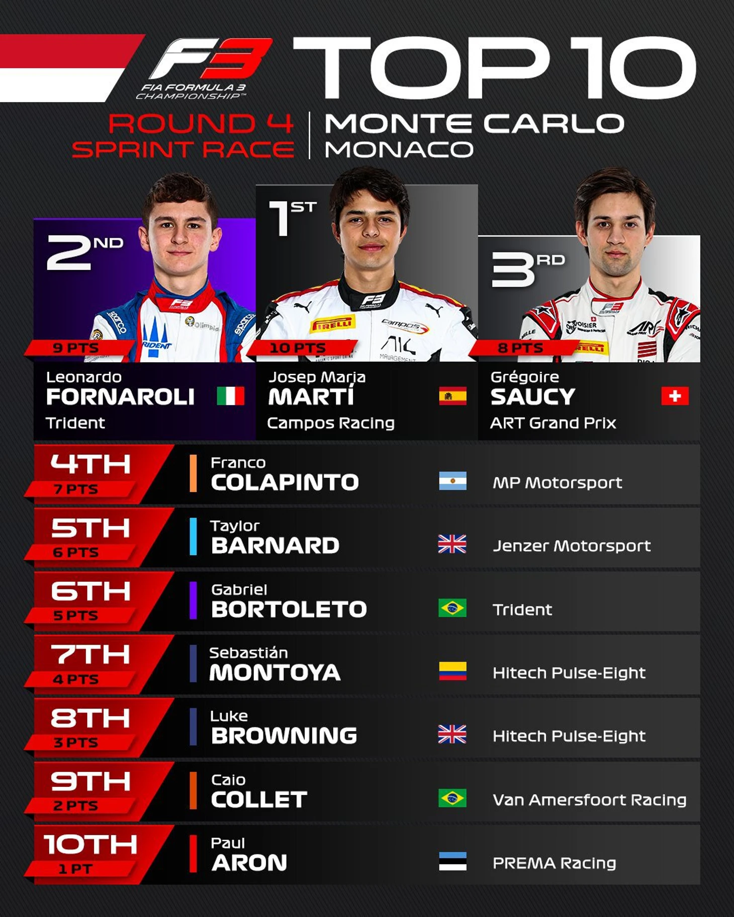 Бортолето по-прежнему возглавляет чемпионат, на его счету 62 очка. Ближайшими конкурентами бразильца являются Соси (44 балла), Марти и пилот «Премы» Дино Беганович (по 31), а также Франко Колапинто из «МП Моторспорт» (28).