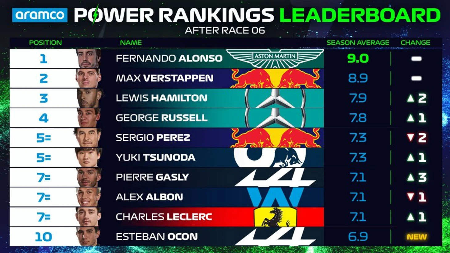 Алонсо остается лучшим пилотом по среднему баллу за сезон-2023, однако отрыв от Ферстаппена сократился до минимума. На третье место переместился Хэмилтон, Окон попал в топ-10.