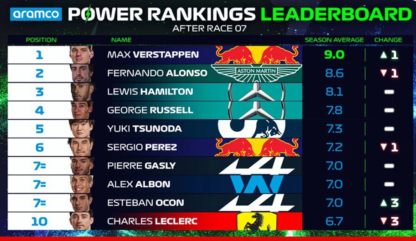 Предыдущий лидер рейтинга в этом сезоне Фернандо Алонсо не попал в топ-10 и в общем зачете уступил первую строчку Ферстаппену.