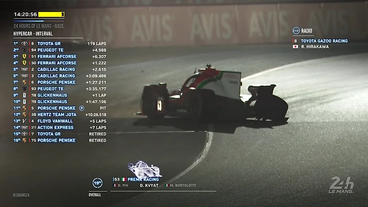 После 13 часов гонки «Тойота» №8 опережает «Феррари» №51 (Пьер Гвиди / Каладо / Джовинацци) всего на 8 секунд, а занимающий третье место «Кадиллак» (Эрл Бамбер / Алекс Линн / Ричард Уэстбрук) проигрывает лидерам 1 минуту и 40 секунд.