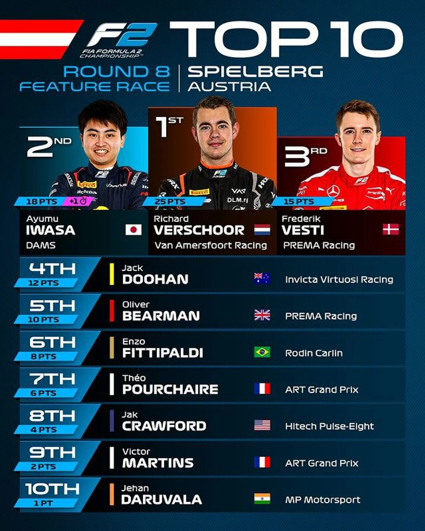 Формула-2. Австрия. Версхор выиграл 2-ю гонку с 11-го места, Иваса – 2-й, Вести – 3-й