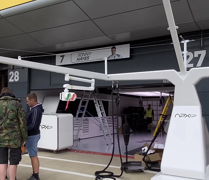 Для «Апекса» подготовили боксы. Кадры из паддока Гран-при Великобритании показывают, что Питт будет играть пилота, которого зовут Сонни Хейс. Гонщик будет выступать под номером последнего чемпиона «Феррари» Кими Райкконена (7) и использовать силовые установки «Мерседеса».