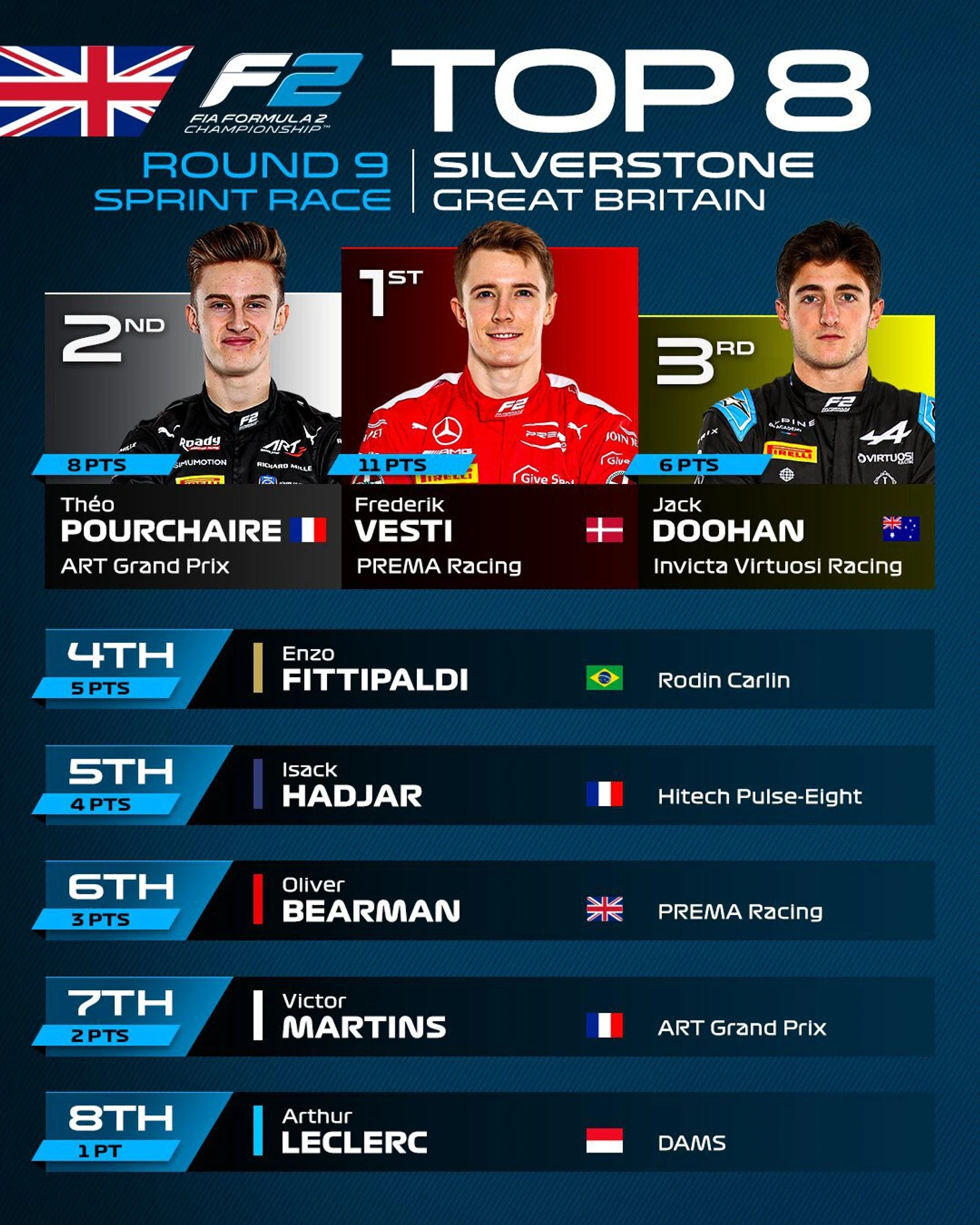 Лидер чемпионата стартовал с поула в дождевых условиях и уверенно довел заезд до победы. Пилоту «АРТ» Тео Пуршеру и Джеку Дуэну из «Виртуози» пришлось побороться за места на подиуме – они финишировали впереди Энцо Фиттипальди («Карлин»), Исака Хаджара («Хайтек») и Оливера Бермэна («Према»).