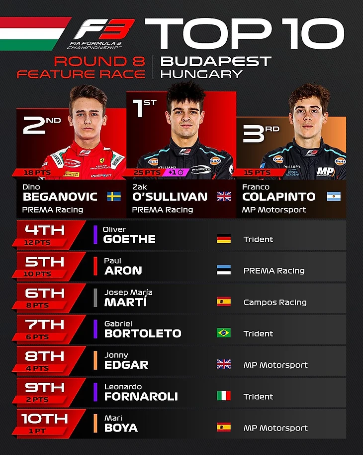 Пилот «Премы» Зак О’Салливан одержал победу в воскресной гонке «Формулы-3» в Венгрии.