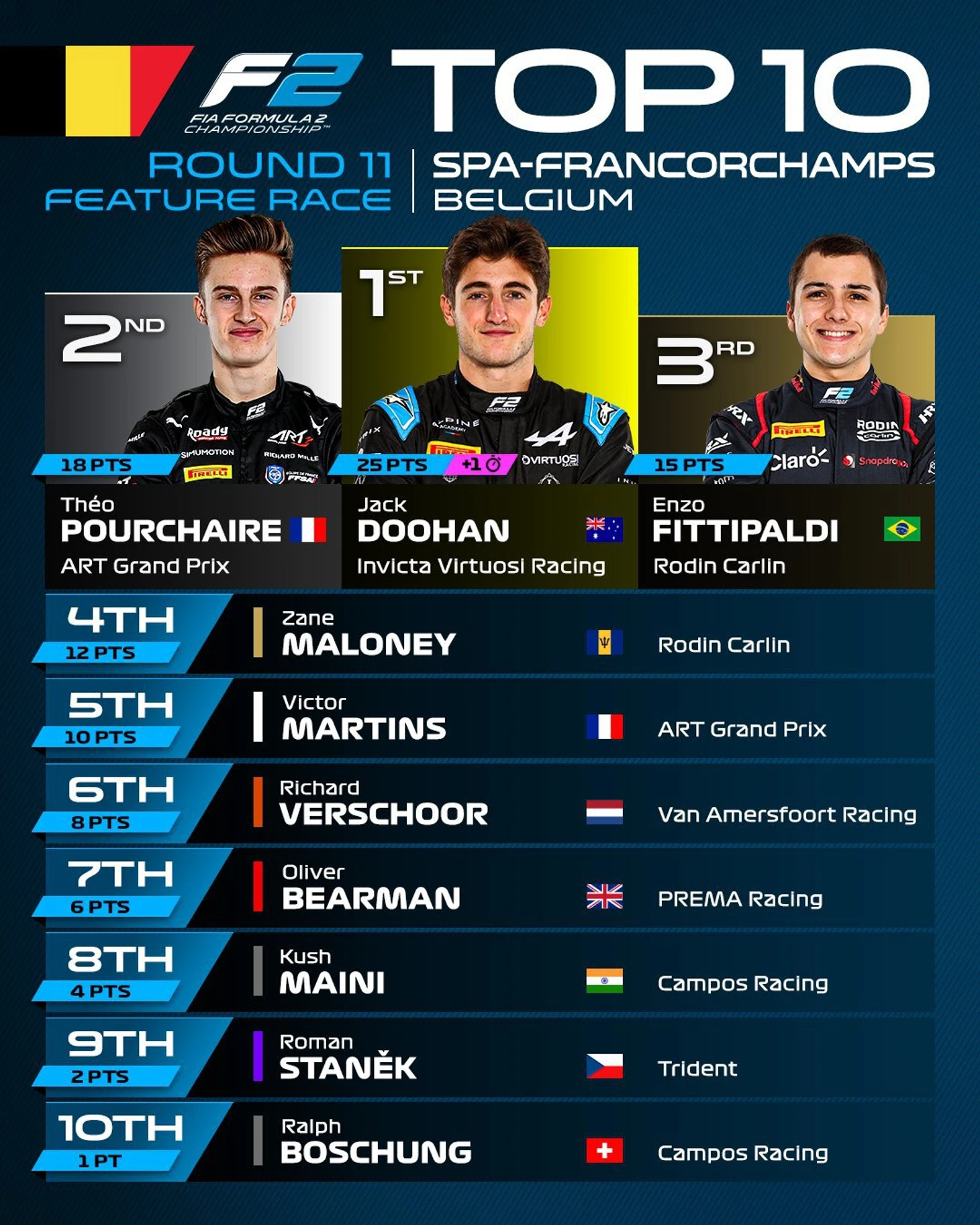Формула-2. Бельгия. Дуэн выиграл 2-ю гонку с 11-го места, Пуршер стал 2-м и возглавил чемпионат после схода Вести до старта, у Фиттипальди 2 подиума за уик-энд