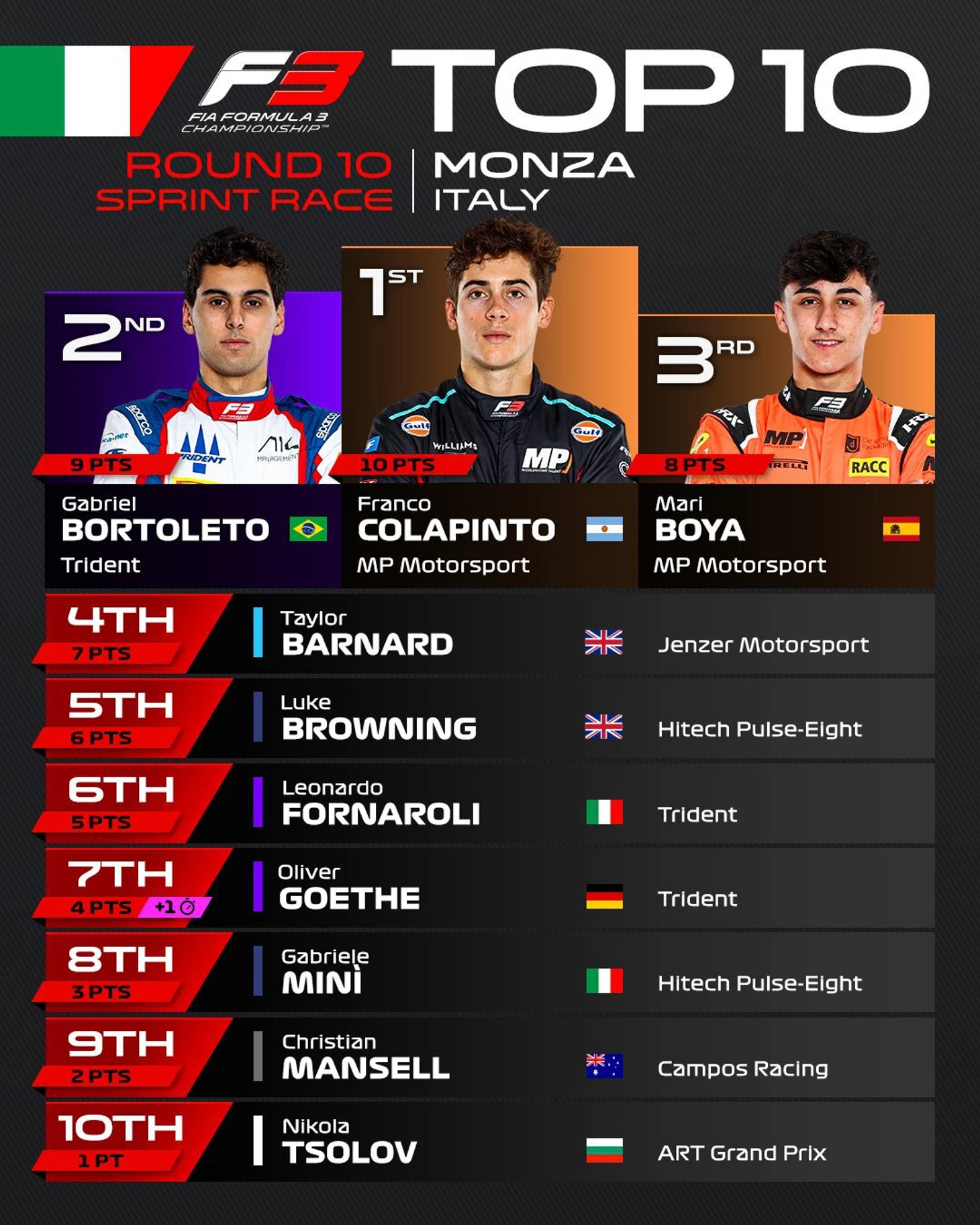 Успех позволил Колапинто выйти на вторую строчку в личном зачете перед финалом сезона, который состоится завтра, 3 сентября. На счету Бортолето 153 очков, Колапинто заработал 110, Арон – 106, Марти – 105, пилот «Премы» Зак О’Салливан – 101. Бедрин располагается на 17-й позиции с 24 баллами.