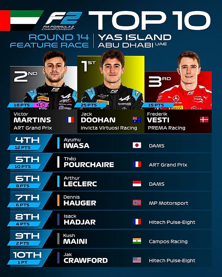 Последнюю гонку сезона в Абу-Даби выиграл пилот «Виртуози» Джек Дуэн, вторым финишировал Виктор Мартен из «АРТ». Вести вырвал третье место в последних поворотах после столкновения с Зейном Мэлоуни из «Карлина», однако этого не хватило для титула.