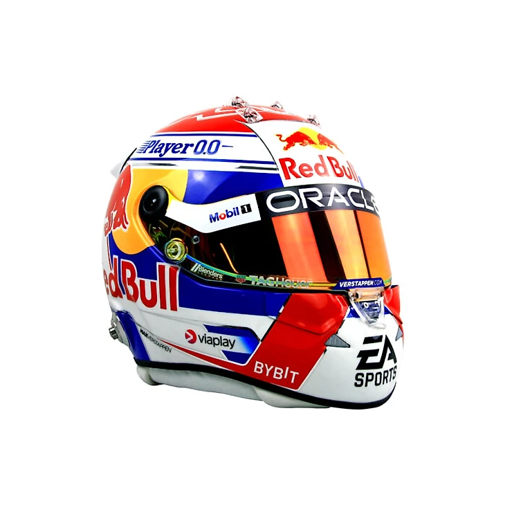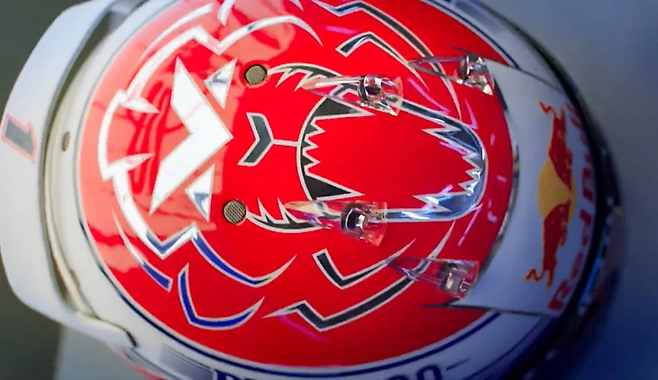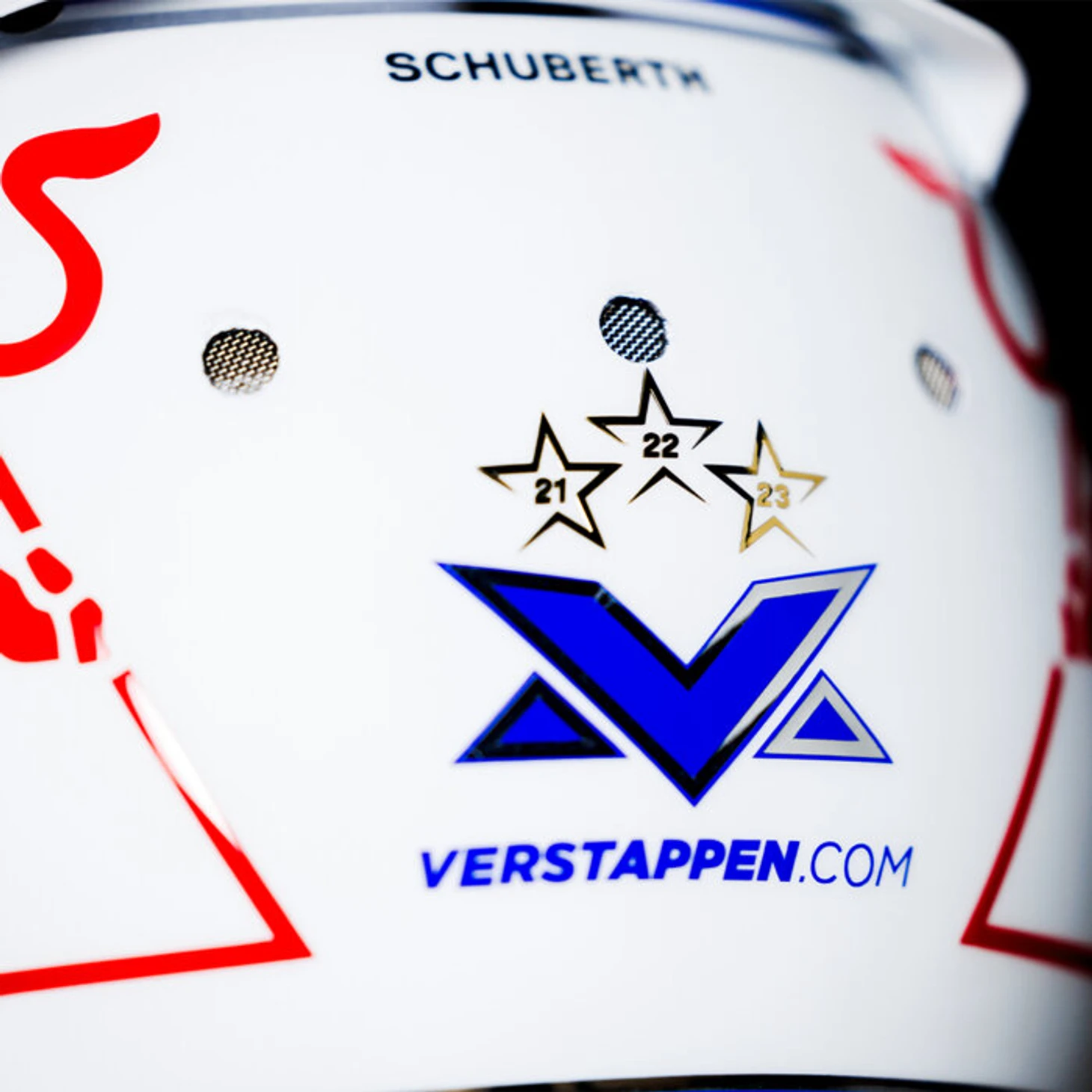 На верхней части присутствует традиционный для пилота «Ред Булл» лев, сзади расположились три звезды в честь титулов Макса.