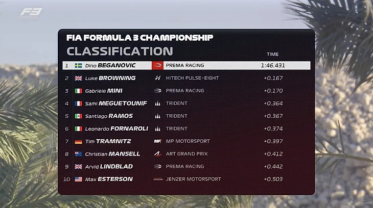 Гонщик «Премы» Дино Беганович показал лучшее время в первой квалификации «Формулы-3» сезона-2024 в Бахрейне.