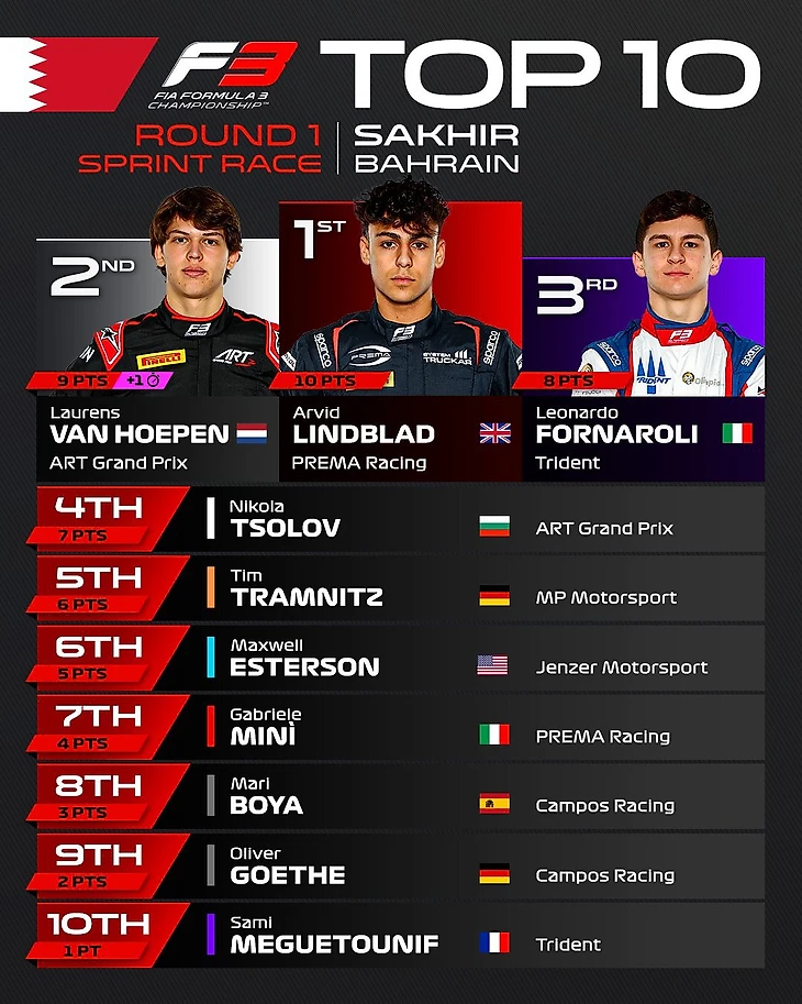 Пилот «Премы» Арвид Линблад одержал победу в первой гонке «Формулы-3» сезона-2024 в Бахрейне.