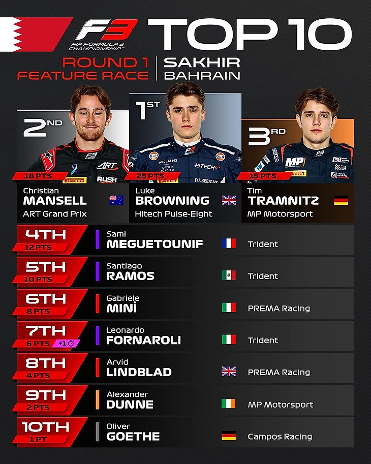 16-летний Линблад выиграл дебютную гонку «Ф-3» в Бахрейне, Бедрин – 13-й