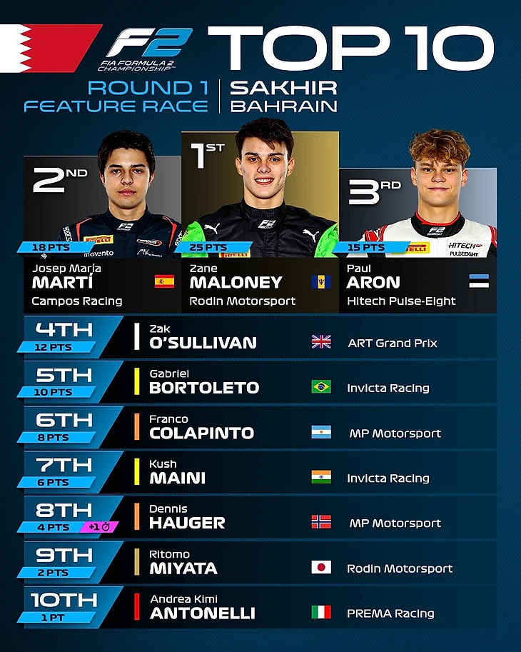 Мэлоуни покидает Бахрейн с 37 очками, в топ-5 личного зачета также входят Марти (24), Арон (19), Бортолето (15) и пилот «АРТ» Зак О’Салливан (14).