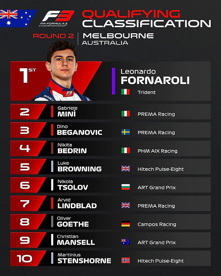 Пилот «Трайдента» Леонардо Форнароли показал лучшее время в квалификации «Формулы-3» в Мельбурне (1.33,044).
