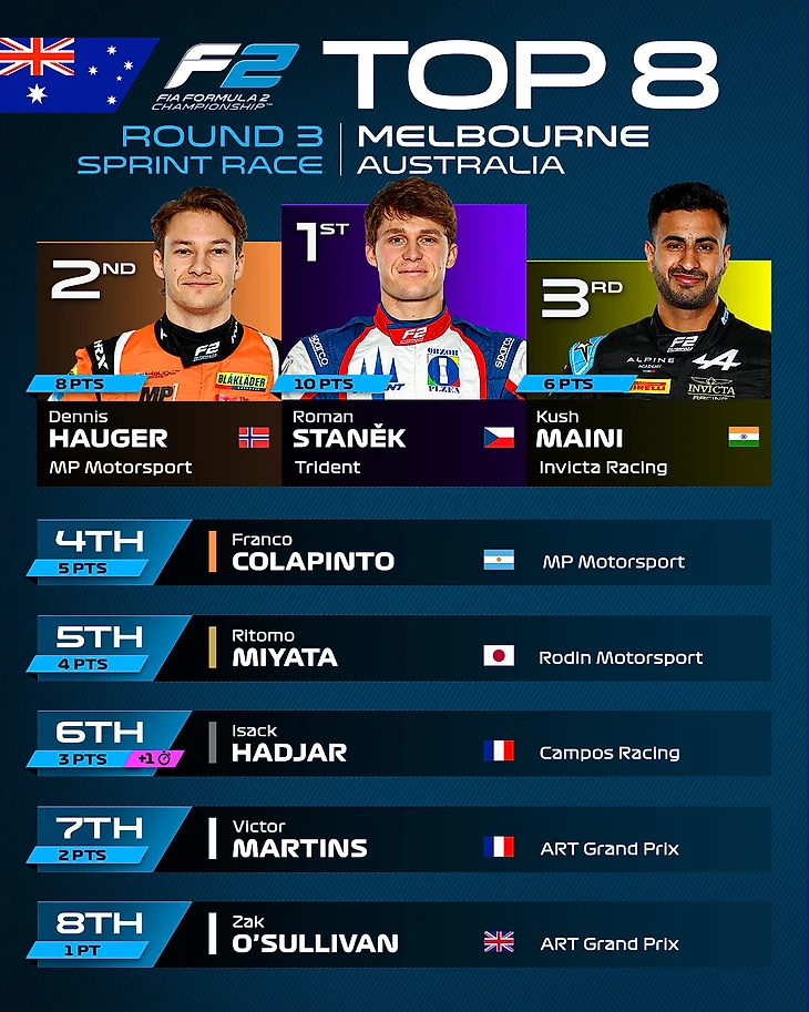 Формула-2. Австралия. Станек выиграл 1-ю гонку после штрафа Хаджара, Хаугер – 2-й, Маини – 3-й, Бермэн – 14-й, Антонелли сошел