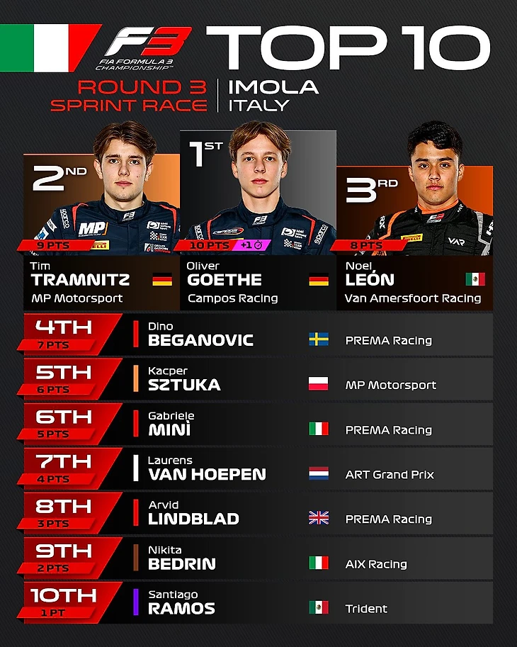 Формула-3. Имола. Гете выиграл 1-ю гонку на последнем круге после четырех выездов машины безопасности, Бедрин – 9-й, у трех лидеров чемпионата равное количество очков