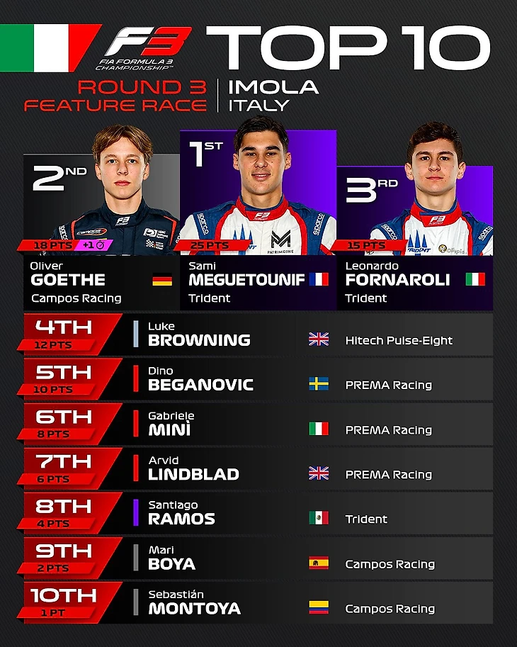 Пилот «Трайдента» Сами Мегетуниф одержал победу в основной гонке «Формулы-3» в Имоле.