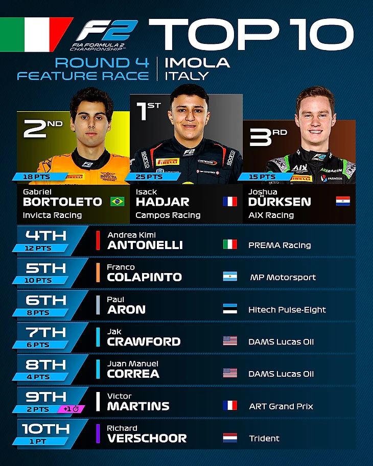 Формула-2. Имола. Хаджар выиграл 2-ю гонку, Антонелли – 4-й, Бермэн потерял лидерство на пит-стопе и стал 19-м