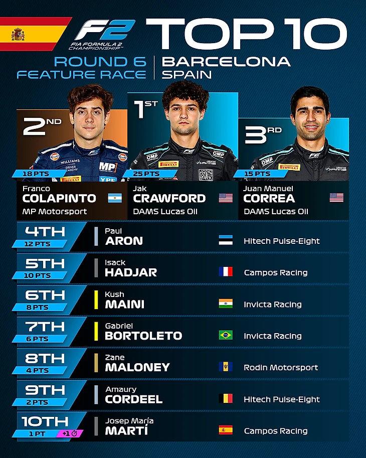 Формула-2. Испания. Кроуфорд выиграл 2-ю гонку, Корреа завоевал первый подиум с 2019-го после того, как лишился трофея в спринте, Антонелли – 12-й, Бермэн – 14-й