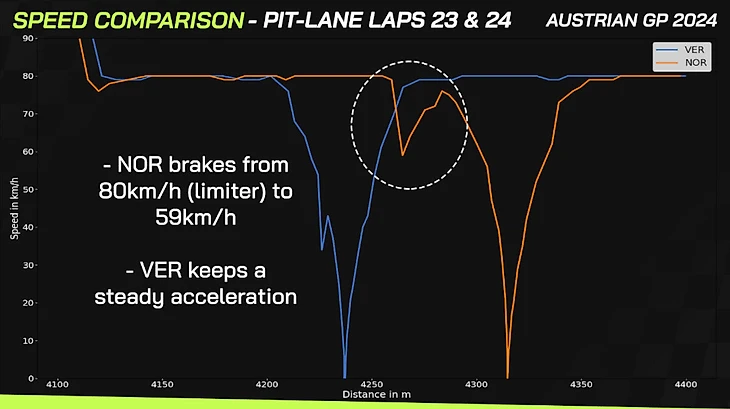 Портал PlanetF1 поделился телеметрией эпизода на 24-м круге. Норрису пришлось затормозить с 80 км/ч (ограничение скорости на пит-лейн) до 59 км/ч, в то время как Ферстаппен продолжил стабильный разгон.