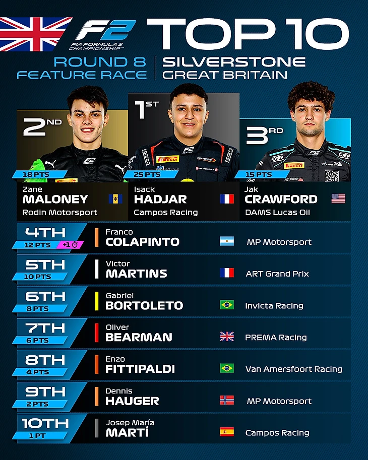 Формула-2. Великобритания. Хаджар выиграл 2-ю гонку и стал лидером чемпионата, Мэлоуни – 2-й, Кроуфорд – 3-й, Бермэн – 7-й, Антонелли сошел