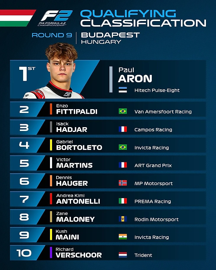 Формула-2. Венгрия. Арон выиграл квалификацию, лидер сезона Хаджар – 3-й, Антонелли – 7-й, Бермэн – 14-й