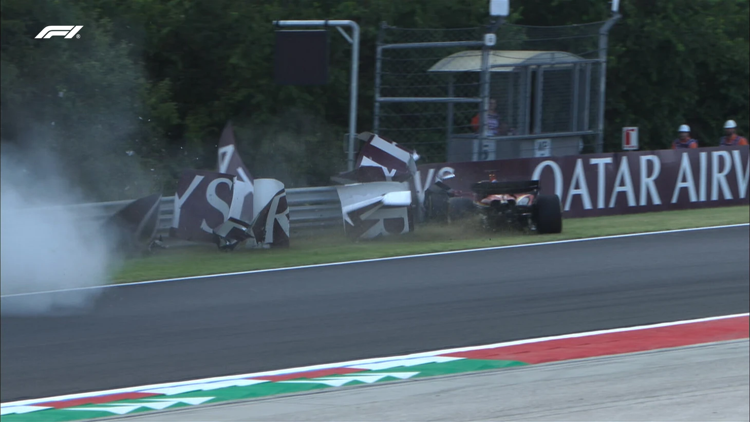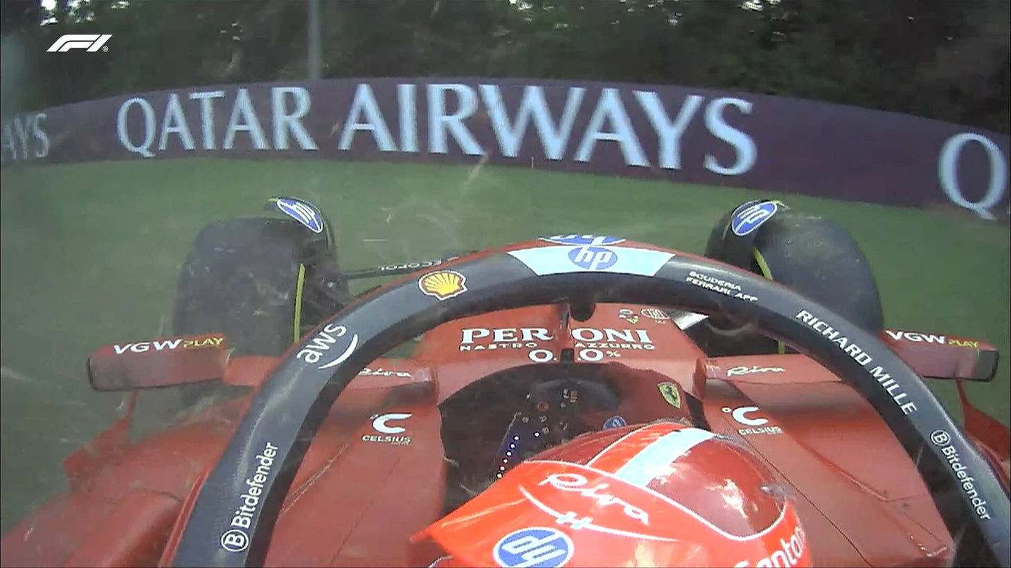 Монегаск развернулся на высокой скорости и повредил переднее антикрыло, дойдя до серьезного контакта с ограждениями задней частью болида, а затем передней.