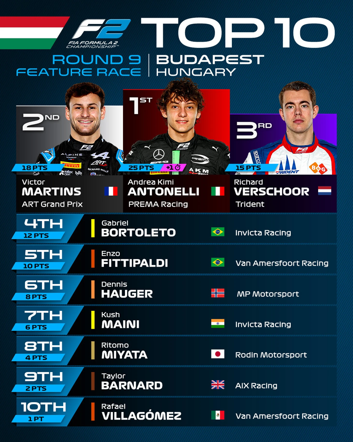 Формула-2. Венгрия. Антонелли выиграл 2-ю гонку с 7-го места, Бермэн – 15-й, лидер сезона Хаджар – 18-й, Арон и Мэлоуни столкнулись и сошли
