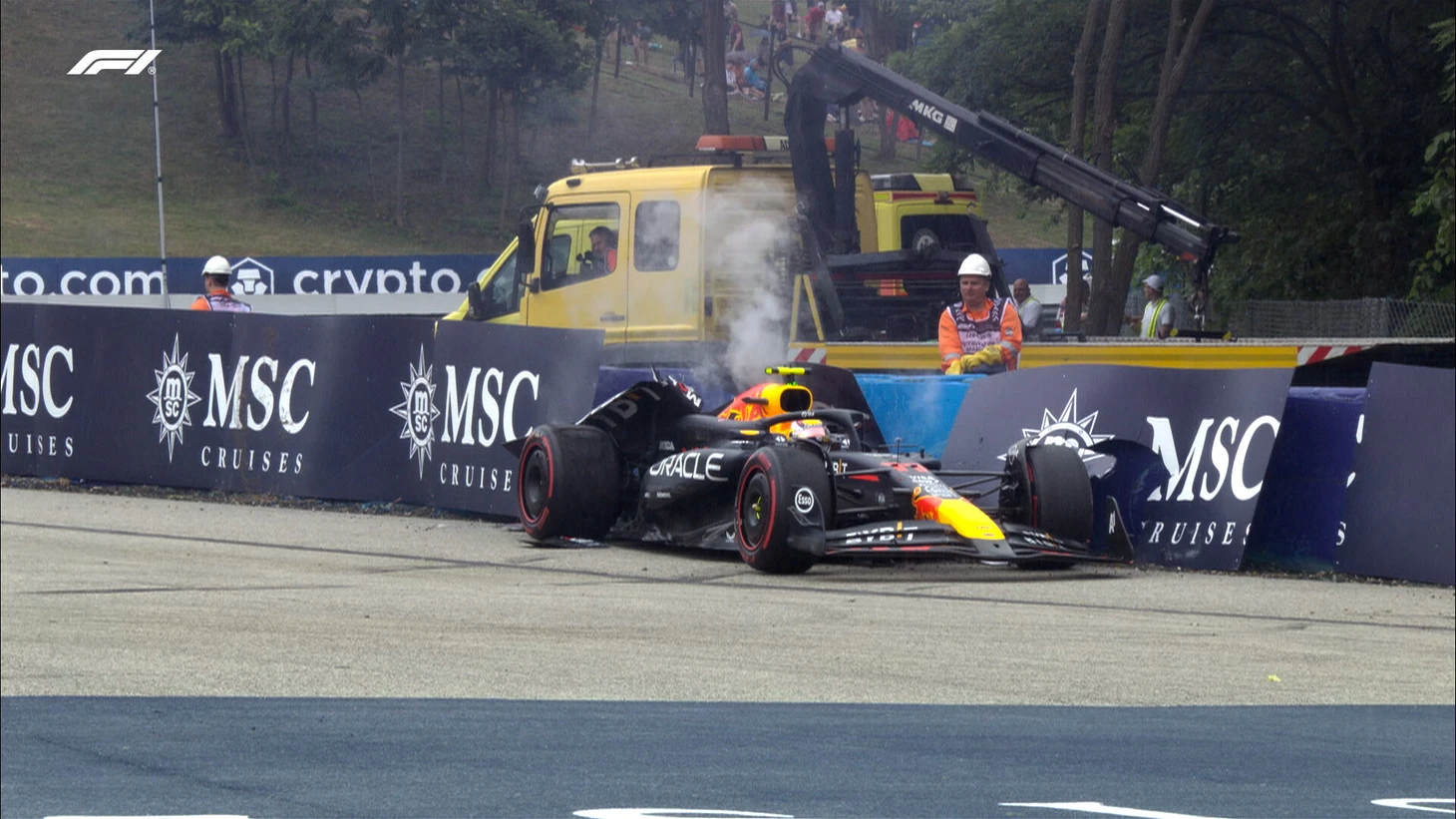 Перес врезался в барьеры задней частью болида в первом сегменте квалификации к Гран-при Венгрии. Гонщик занял 16-е место по итогам сессии.