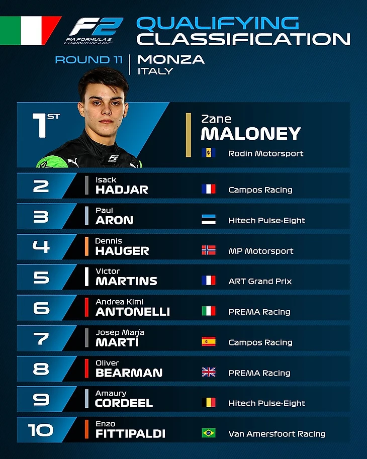 Пилот «Родена» Зейн Мэлоуни стал быстрейшим по итогам квалификации «Формулы-2» в Монце.