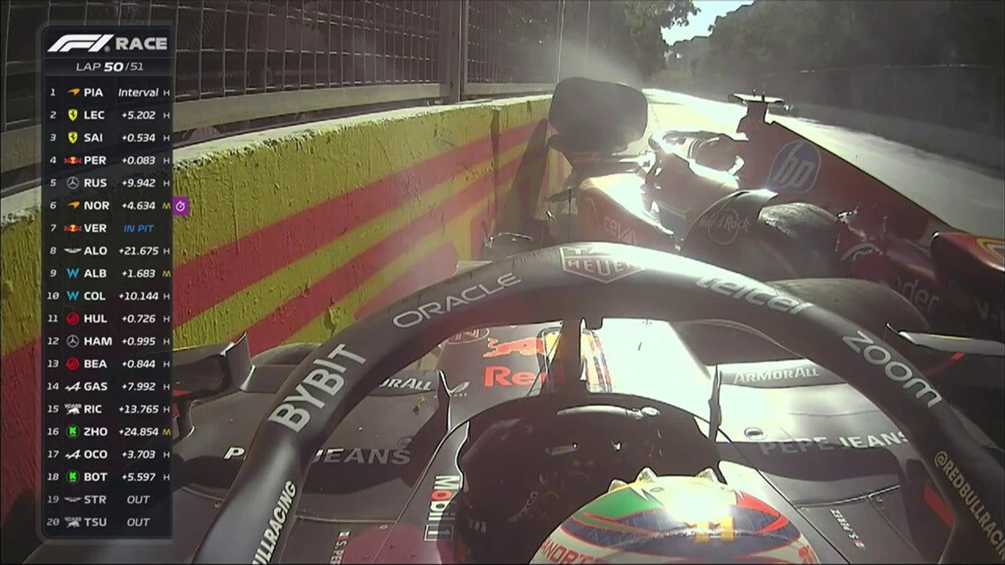Пилоты «Феррари» и «Ред Булл» боролись друг с другом и с Шарлем Леклером за места на подиуме. В итоге борьба закончилась столкновением. Оба гонщика не пострадали в аварии, но не смогли добраться до финиша.
